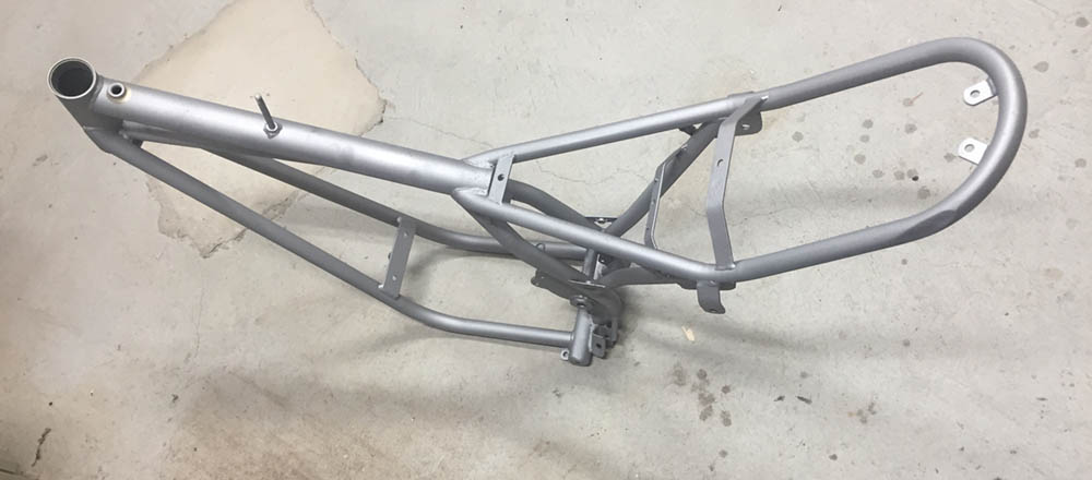 Here is a shot of the frame after sandblasting. Note the flat spot on the frame and I’ve included a shot of the corrosion under the gas tank. The corrosion seems typical and has not affected the integrity of the frame.
